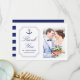 Envíe a sus bodas invitados una foto personalizada con temática náutica, tarjeta de agradecimiento que adorarán. Este diseño de moda muestra tu foto a la derecha y a la izquierda es tu mensaje y nombres para personalizar acentuados por un ancla azul marino. La parte posterior de la tarjeta tiene rayas azul marino y blancas. Diseñado por la artista ©Susan Coffey.