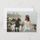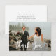 Una tarjeta de fotos moderna con un guión de pincel blanco, una foto de los recién casados y un mensaje de agradecimiento a sus invitados.