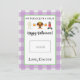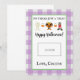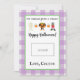 Esta tarjeta de profesor de Halloween presenta un fondo de manteca morada y blanca con acentos verdes y dice "No hay trucos, solamente un regalo. ¡Feliz Halloween!" y un lindo trío de disfraces. También hay un espacio para dejar una tarjeta de regalo. Personalice con el nombre de su hijo.