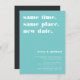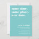 ¿Necesita posponer o reprogramar a su boda? Infórmese con estas tarjetas modernas y alegres en agua turquesa de moda. Funciones de diseño "misma hora, mismo lugar, nueva fecha" en la parte superior con su nueva fecha de boda y detalles debajo.