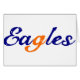 Camisetas, tazas, bolsos, botones, pegatinas, imanes, que incluyen la palabra Águilas escrita en un guion azul grunge con la letra G escrita en naranja.