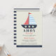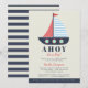 Ahoy Es una invitación de Boy Baby Shower - Nuestra plantilla náutica, Baby Shower Invitation es un moderno diseño de ducha náutica con velero azul y blanco. También incluye escritura a mano y tipografía moderna. AHOY está en negrita, letras azul marino. La parte trasera de la invitación es azul marino y rayas crema para coordinar con la parte delantera.