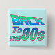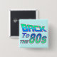 Botón cuadrado con la frase "De vuelta a los 80" impreso en bellas letras azules, verdes y fucsia en azul claro. Consulte el encadenamiento de llaves metalizado cuadrado superior y el collar cuadrado. Vea toda la colección de botones y pines Tubular 80s en los TOUCHES ESPECIALES| Sección Favoritos de la fiesta.