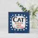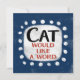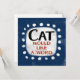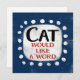 Un diseño tipográfico irreverente y lindo que dice "al gato le gustaría una palabra". Presenta texto en negro y rojo sobre un rectángulo blanco con puntos blancos divertidos y juguetones rodeándolo, todo sobre un fondo azul.