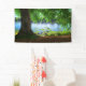 Tarde de verano tranquila al lado de un lago todavía seco, con vistas a la sombra de un arce rojo con ramas y hojas verdes que oscilan en la orilla del agua. Las nenúfares flotan en la superficie brillante, y una cigüeña permanece inmóvil en el agua, mientras las libélulas y las mariposas bailan entre los iris y las carpas que rodean la orilla. La luz del sol brilla y brilla entre las pequeñas olas del lago.