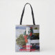 Una toma de una cerca blanca con nieve y una reverencia. Con el árbol verde en el fondo que es brillante y colorido que está en un TOTE BAG Navidades.