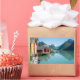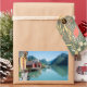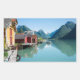 Pegatina fotográfico rectangular de un paisaje con casas de campo en la aldea de Fjærland (Mundal) y montañas con reflejo en el agua del fiordo Fjrlandsfjord, Sogn og Fjordane en Noruega.