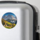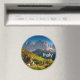 Imán de recuerdo de la localidad de St. Magdalena con su iglesia en el Villnoesstal del Tirol del Sur, Italia, durante la temporada de otoño con las montañas Geisler Dolomitas al fondo y el texto: "Italia".