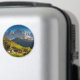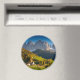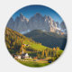 Imán fotográfico redondo de recuerdo del pueblo de St. Magdalena con su iglesia en el Villnoesstal en el Tirol del Sur, Italia, durante la temporada de otoño con las montañas Geisler Dolomitas al fondo.