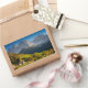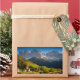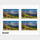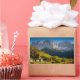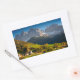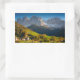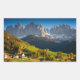 Foto rectangular pegatina de recuerdo del pueblo de St. Magdalena con su iglesia en el Villnoesstal en el Tirol del Sur, Italia, durante la temporada de otoño con las montañas Geisler Dolomitas al fondo.