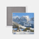 Refrigerador de souvenirs imán del pueblo de St. Magdalena (Santa Maddalena) con su iglesia en el Villnoesstal en Tirol del Sur, Italia, en la nieve durante el invierno con el texto: "Italia".