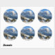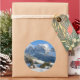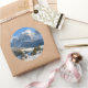 Pegatina fotográfico de recuerdo de la aldea de St. Magdalena (Santa Maddalena) con su iglesia en el Villnoesstal en Tirol del Sur, Italia, en la nieve durante el invierno.
