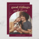 Esta divertida y festiva tarjeta de Navidades cuenta con su foto familiar favorita en forma de arco de moda, con un color de vino tinto con un tono jovial y muchos textos falsos de oro y acentos para un moderno estilo Navidad.
