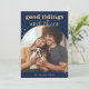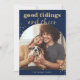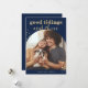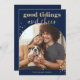 Esta divertida y festiva tarjeta de Navidades incluye tu foto familiar favorita en forma de arco de moda, con un profundo color azul con un tono de joyas y muchos textos falsos de oro y acentos para un aspecto moderno de Navidad.
