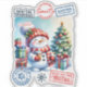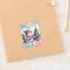 Una encantadora pegatina navideña muestra a un animado muñeco de nieve sosteniendo una bebida caliente, rodeado de regalos coloridos. En el fondo hay un árbol de fiesta adornado con adornos que cautivan el alegre espíritu de la temporada navideña con estampillas juguetonas.