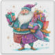 Este delicioso pegatina festivo tiene un personaje alegre vestido de violeta, adornado con regalos coloridos y una sonrisa cálida.