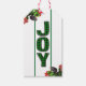La palabra 'JOY' está en un cheque verde y negro con dos líneas verdes gobernadas a cada lado. En las esquinas opuestas se encuentran las bayas rojas y los conos de pino. Una versión más pequeña del diseño está en la parte posterior, con un área para texto personalizado.
