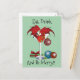 Un simpático dragón rojo en una copa de martini sosteniendo una aceituna verde. Adornos, un regalo de Navidad y aceitunas verdes por todas partes.