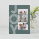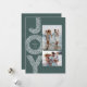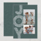 Una festiva ráfaga de ALEGRÍA enmarca dos fotos en esta tarjeta de Navidad única. Perfecta para enviar saludos navideños a familiares y amigos, cuenta con una foto vertical y una horizontal en un fondo verde de moda. La parte trasera de la tarjeta es un verde a juego moteado con un patrón de nieve blanco coordinado.