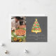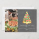 Ilustración de una porción de pizza con forma de árbol de Navidad coronada con estrellas. El fondo está inspirado en una pizarra. Personaliza el nombre, año y foto.