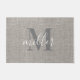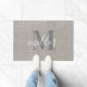 Alfombra de bienvenida diseñada a medida con monograma personalizado y nombre de familia en caligrafía moderna a mano impresa en un fondo de estilo granja/arpillera rústica.