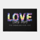 Esta alfombra de bienvenida personalizada, "El amor vive aquí", sería un hermoso añadido a cualquier hogar. ¡Perfecta para regalar en bodas o fiestas de despedida de soltera!