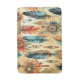 Azteca boho nativa acuarela de Estados Unidos diseño tribal de plumas azul turquesa, girasoles rojos abstractos y formas geométricas sobre un fondo de arena desértica.