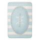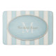 Esta alfombra de baño personalizado tiene un monograma de marfil pálido en un marco ovalado sobre un fondo de rayas anchas en azul pálido y blanco antiguo.