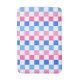 A checkerboard pattern of pink, blue, and white squares creates a vibrant and lively visual effect, conveying playfulness and energy.