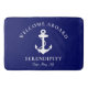 Una moderna alfombra de baño de temática náutica de moda para el barco, con un ilustracion blanco de ancla sobre un fondo azul marino. Puede personalizar el texto y el monograma de "Welcome Aboard" con el nombre y la ubicación de su barco en una elegante tipografía blanca.