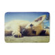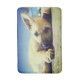 Esta alfombra de baño tiene un lindo cachorro retratado en ella.