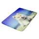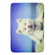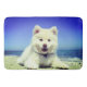 Esta alfombra de baño tiene un lindo cachorro blanco retratado en ella.