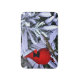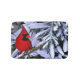 Un hermoso Cardenal Rojo descansando entre los nevados Evergreens de invierno.
