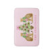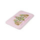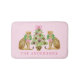 This Christmas bath mat has two Leopards wearing wreaths with a pink bow on either side of a Christmas Tree. The background is a light pink.