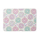Una alfombra de baño con un patrón deliciosamente divertido. Ilustracion de donuts de color rosa pastel y verde con salpicaduras y glaseado.