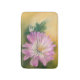 Una obra de arte que representa una flor de crisantemo morado-rosa y cremoso-blanco con un conjunto de barras y hojas contra el ocre amarillo dorado y el verde oliva decora esta elegante alfombra de baño.