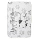 Pequeño y bonito bull terrier inglés, blanco con parche de ojos negros, sobre un fondo de huellas de pata en escala de grises...¡clásico! Personalizar a tu gusto (incluso borra todo el texto).