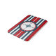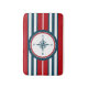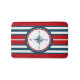 Diseño náutico con decoración de brújula en forma redonda sobre fondo rayado rojo, azul y blanco