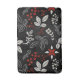 Elegant botanical pattern on black background featuring white leaves, red berries, and intricate floral designs in gold accents, creating a festive, decorative feel.