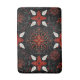 Intricate black background with a symmetrical floral pattern in red, white, and gold. Curved lines and dots add detail, creating an elegant, festive feel.