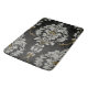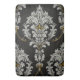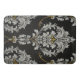 Un lujoso y ornamentado damasco con intrincados motivos florales blancos y dorados sobre un fondo negro. La decoración es clásica y refinada, con tapices de época, tejidos y decoración de gama alta.