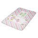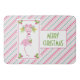 Una alfombrilla de baño caprichosa de Navidad tropical. Un elegante flamenco rosa con una pierna levantada. Con un sombrero de Santa rosa y algunos acebos de temporada. Los acebos con bayas también decoran las esquinas. Un ramo floral con bastones de caramelo sobre su cabeza. Un fondo a rayas de bastones de caramelo rosa y verde. Feliz Navidad escrito en letras art déco verdes y negritas.