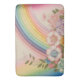 Un arco iris termina en un jardín de flores pastel.