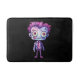 Una alfombra de baño con un lindo ilustracion. Un monstruo Frankenstein con el pelo rosado y púrpura y un abrigo y corbata de zapatillas.