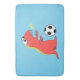 Alfombra de baño divertida adaptable del fútbol con un ilustracion colorido de un dinosaurio divertido con una respiración del fuego que juega a fútbol en fondo azul. Este diseño divertido del dinosaurio harían un gran regalo para los muchachos y los hombres que aman el jugar de fútbol.