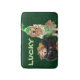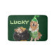Esta alfombra de baño presenta un leprechaun de recuperación dorada con un cachorro dorado como olla de oro. El mensaje dice: "SUERTE".