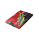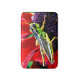 Esta alfombra de baño animal tiene un saltamontes verde brillante, amarillo y negro encaramado en el centro púrpura de una flor con pétalos rojos preciosos.