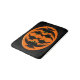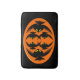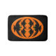 Esta increíble alfombra de baño tiene un oval naranja con seis cuervos. Cada cuervo tiene ojos amarillos con pupilas negras y alas estiradas. Los cuervos están volando unos hacia otros formando una forma oval. El fondo es negro.