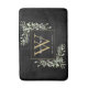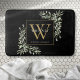 Alfombra de baño de hojas de verde monograma de nombre en estilo acuarela moderna elegante con una inicial de monograma dorado con su nombre en letra clásica blanca sobre fondo negro. Diseñado por Thisisnotme©