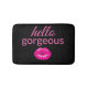 Relájese en la decoración de su cuarto de baño con este personalizado "Hello Gorgeous" Bath Mat. Este diseño presenta una imagen de labios rosados brillantes junto con un tipo de letra rosada sobre un fondo negro.